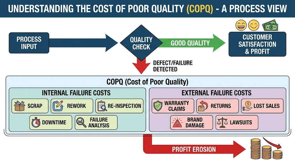 The Cost of Poor Quality (COPQ) is much higher than what you see in budget reports or balance sheets. A lot of the biggest losses are hidden, indirect, and slowly hurt a company’s finances, team performance, and ability to compete in the long run.