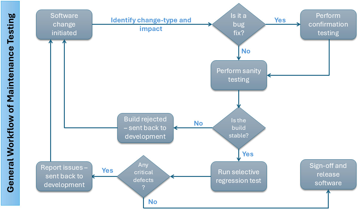Maintenance testing is simply the process of testing changes made to a software system that’s already up and running. These changes could be anything from fixing annoying bugs, adding cool new features, or making sure it plays nicely with the latest operating system. It’s a crucial part of keeping software healthy throughout its entire life.