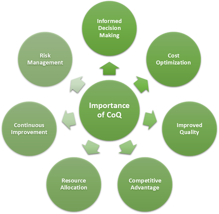 • Cost optimization: CoQ provides insights into where money is being spent and helps identify areas where costs can be reduced. For example, investing more in prevention might lower internal and external failure costs in the long run which can lead to overall cost savings.