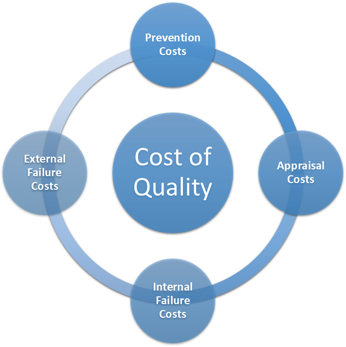Cost of Quality (CoQ)=Prevention Costs+Appraisal Costs+Internal Failure Costs+External Failure Costs