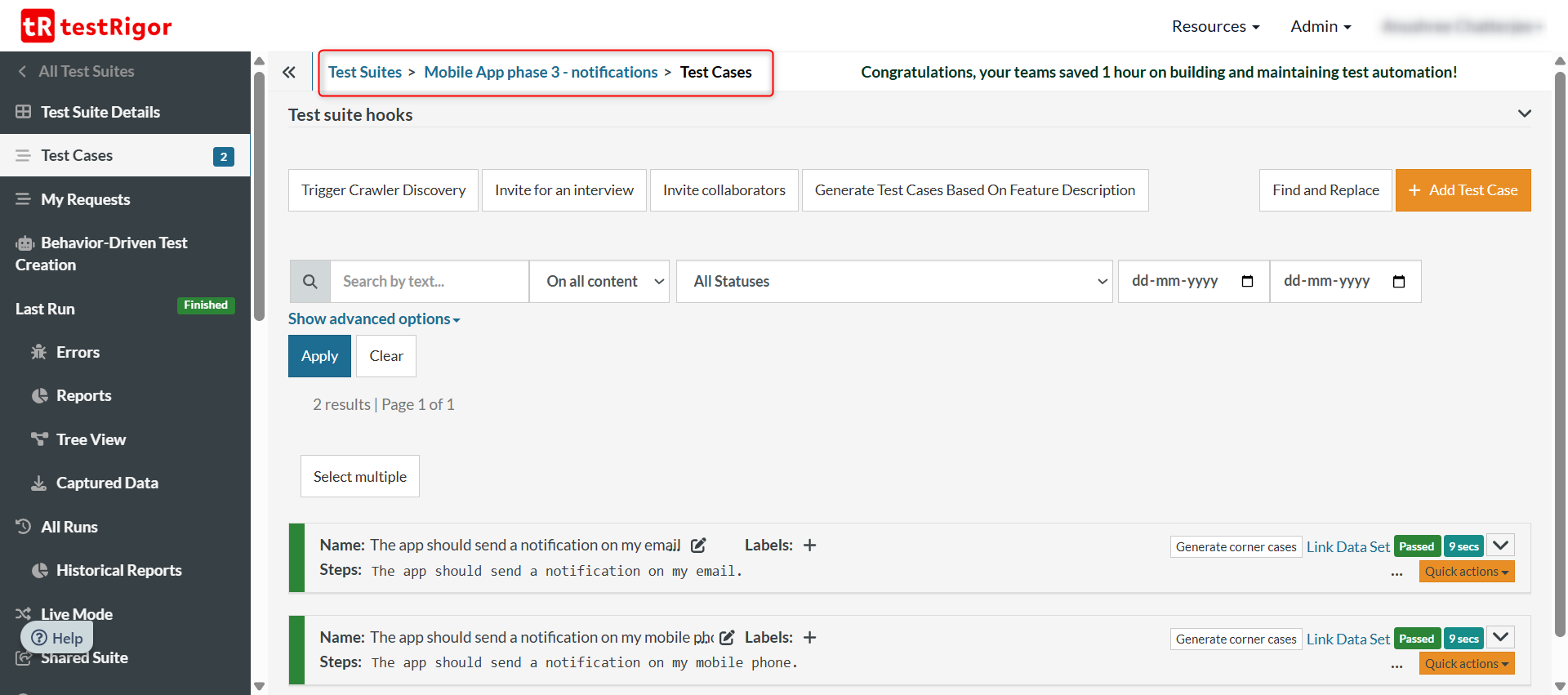 Since testRigor is cloud-based and has its own libraries, you need not fear a complex setup. testRigor also supports migrating your existing manual test cases from test management tools such as TestRail, PractiTest, Zephyr, etc. You can refine or even rewrite your manual test cases with reusable steps (subroutines).