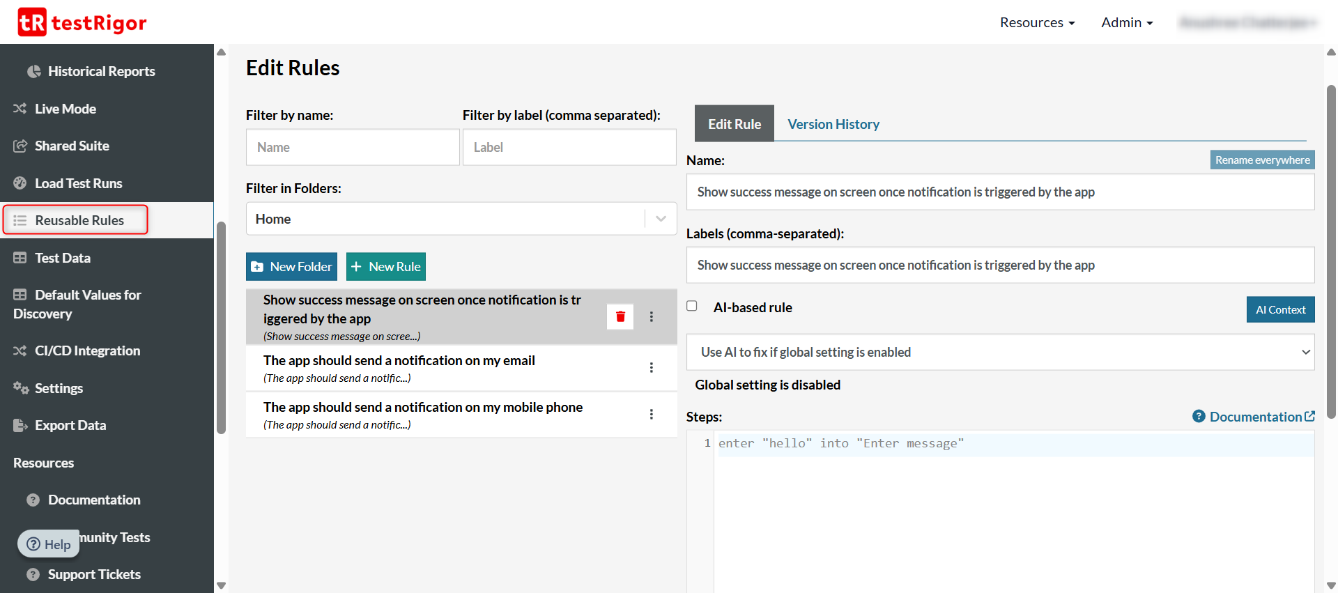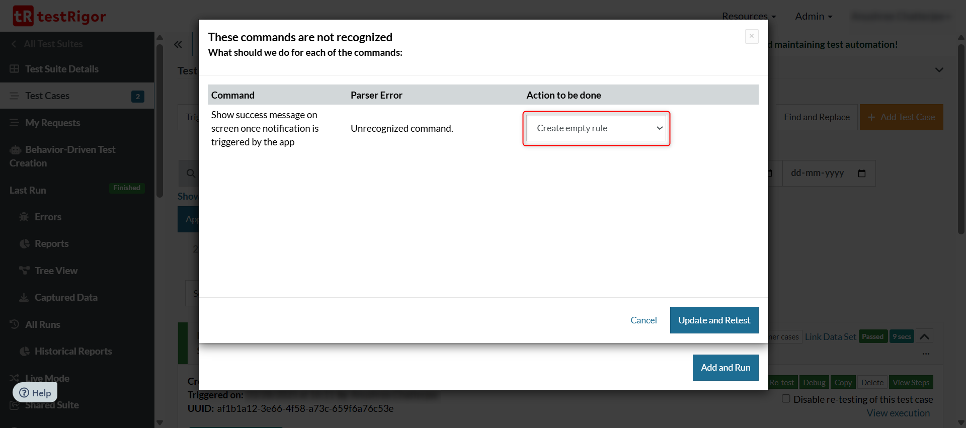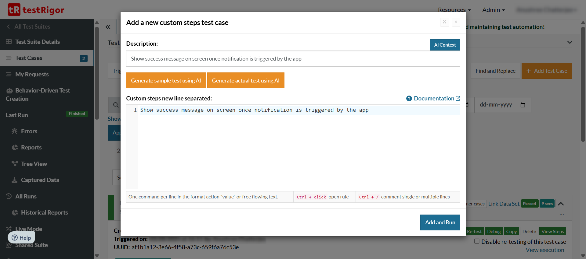 This will let you save the test case as is for the discussion phase. Later, the steps can be added to the test case, or you can edit the empty rules with more test steps in plain English, or you can use a host of AI features that testRigor offers to let the tool generate test steps for you based on a descriptive prompt.