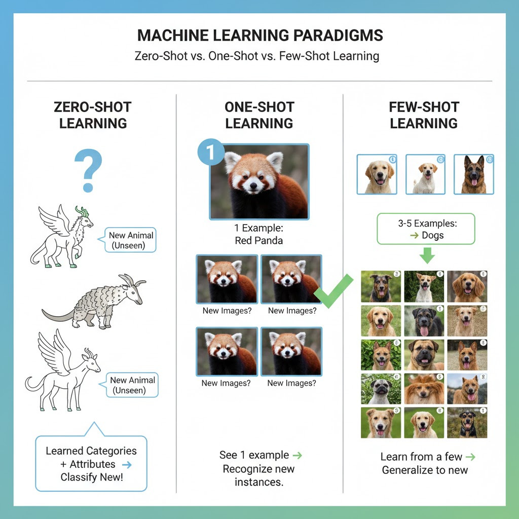 Definition Model predicts unseen classes with no prior examples, relying on semantics and knowledge transfer. Model learns from a single example to recognize or generalize new concepts. Model learns from a few labeled samples (2-100) to adapt quickly to new tasks.