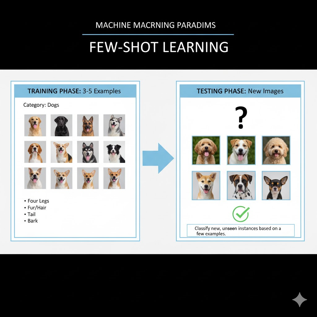 Common Use Cases Image recognition of unseen objects, cross-domain NLP tasks, and reasoning-based AI. Facial recognition, rare disease diagnosis, and voice identification. Few-shot prompting in LLMs, low-resource translation, and adaptive autonomous systems.