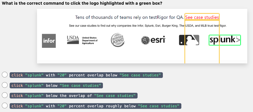 select "click \"splunk\" with \"20\" percent overlap below \"See case studies\"" from the answers