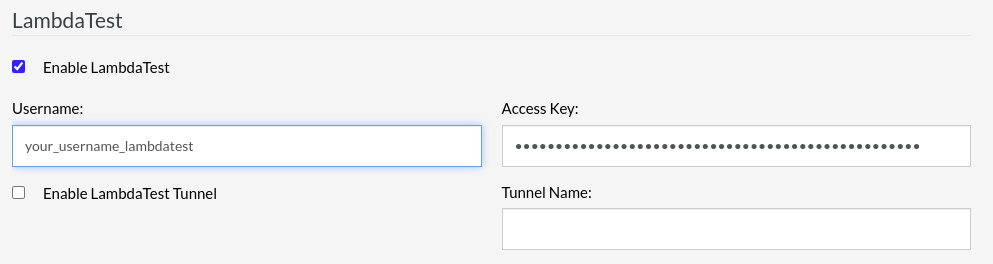 If you have a LambdaTest Tunnel, you can enable the option and fill in the Tunnel Name.