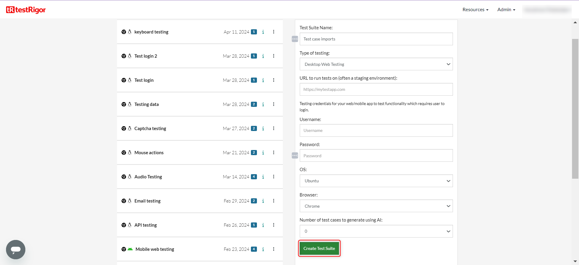 Option 2: Otherwise, create a new test suite if you do not have any. Enter the below information while creating a new test suite: