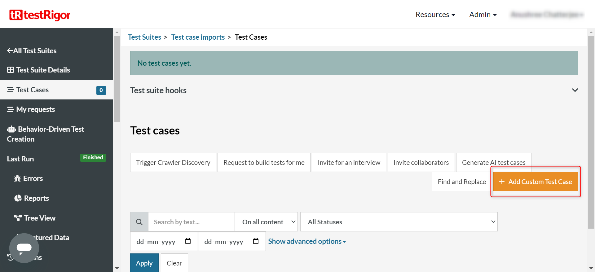 Option 1: If you have created test suites, click the test suite where you want to import test cases from qTest. You will be taken to the testRigor’s Test Cases screen for that particular test suite.