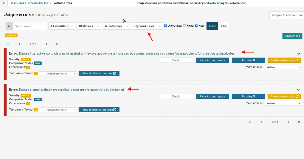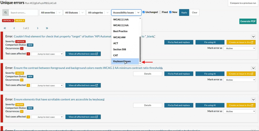 Dedicated Keyboard Issues Filter: Quickly isolate and review accessibility errors related to keyboard navigation, ensuring comprehensive coverage of keyboard-specific concerns.