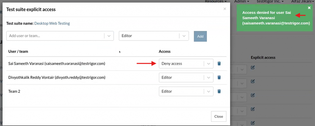 Deny Access Option: Explicitly block users from viewing specific test suites, even if they have broad company-wide access.