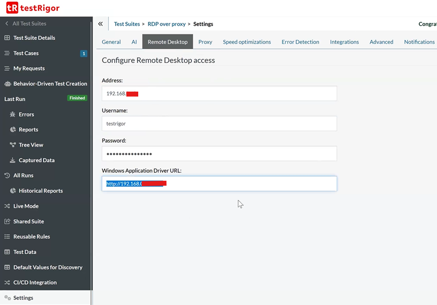 Now, if the customer has provided an HTTP Proxy to work with their infrastructure (Settings -> Proxy), or they have already set up a tunnel with the proxy as we do for web testing, users can bypass the need for separate tunneling configurations for RDP and Win driver ports using local networks in Remote Desktop Address (Settings -> Remote Desktop). This simplifies the initial setup process and eliminates the requirement for additional tunneling when a customer-provided proxy is available. To illustrate it, you can check how the first image below shows the current Proxy configuration, and how the second image shows a local connection to your RDP machine where you’re going to perform the testings.