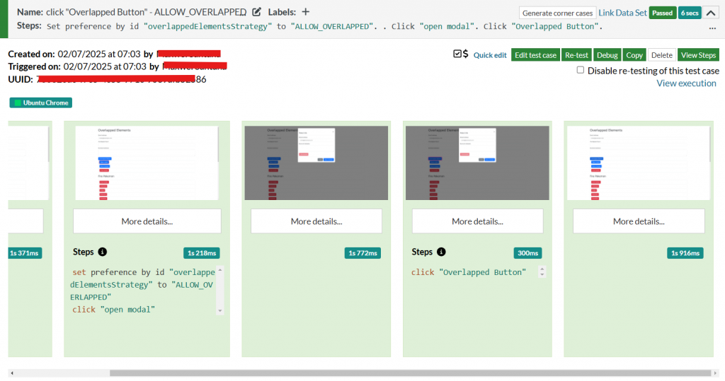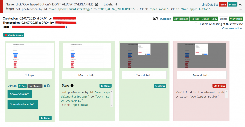 Additionally, users can utilize suffixes to specify whether features should consider only non-overlapped or all elements. This flexibility extends to properties and command extensions for actions like click, enter, and check. By choosing visible+accessible elements only, users can refine their workflows to focus on actionable components within their applications. You can check the next example: We have a site with different overlapped elements. If we enable or disable this setting, it will allow in the first run the click on the overlapped element (Allow overlapped), and it won’t allow it in the second run (Don’t allow overlapped). You can check the images below: