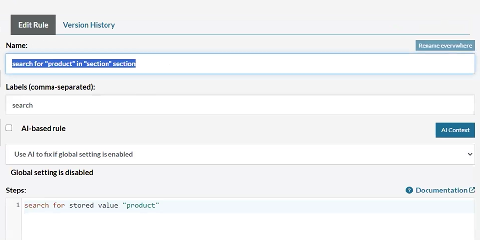 IMPORTANT: As you may notice, the last reusable rule didn’t have the “section” parameter in the reusable rule steps; so this is important, because when using reusable rules with AI, you can add more parameters to the rule and AI will make it’s magic, as you can just avoid specifying the parameters, and testRigor AI will find them and add them to the test case accordingly to context: